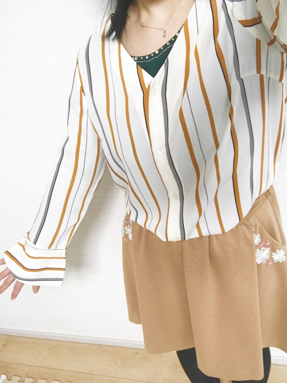 ロピピクニックのストライプシャツやっと着れた✨ いざ職場に来て行ったらハデな気がしたから,プルゾン羽織ったりして誤魔化したけど,着心地良かったし,袖先のフレアも邪魔にならない程度に揺れて良かった◎ 一緒に買ったシュシュは作業の時だけ付けてました^^
