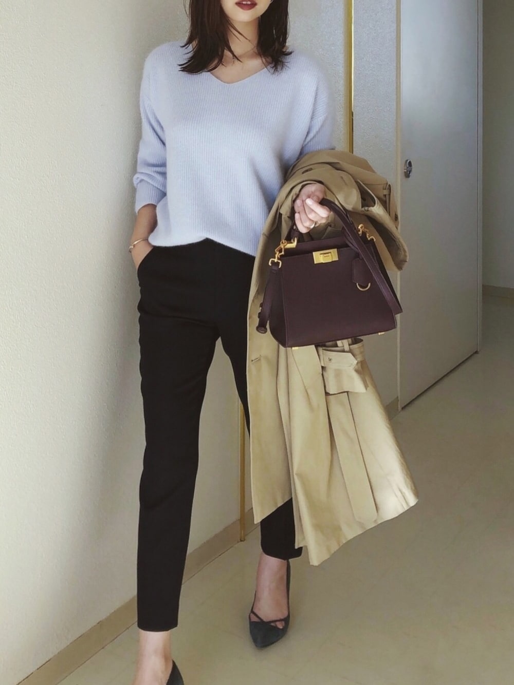 アイスブルーのニットにネイビーパンツでシンプル定番スタイル ボルドーの差し色がポイント😊 TONALのFOXVネックニット🧶 本日¥2000クーポンが出てますよ✨