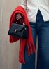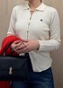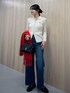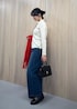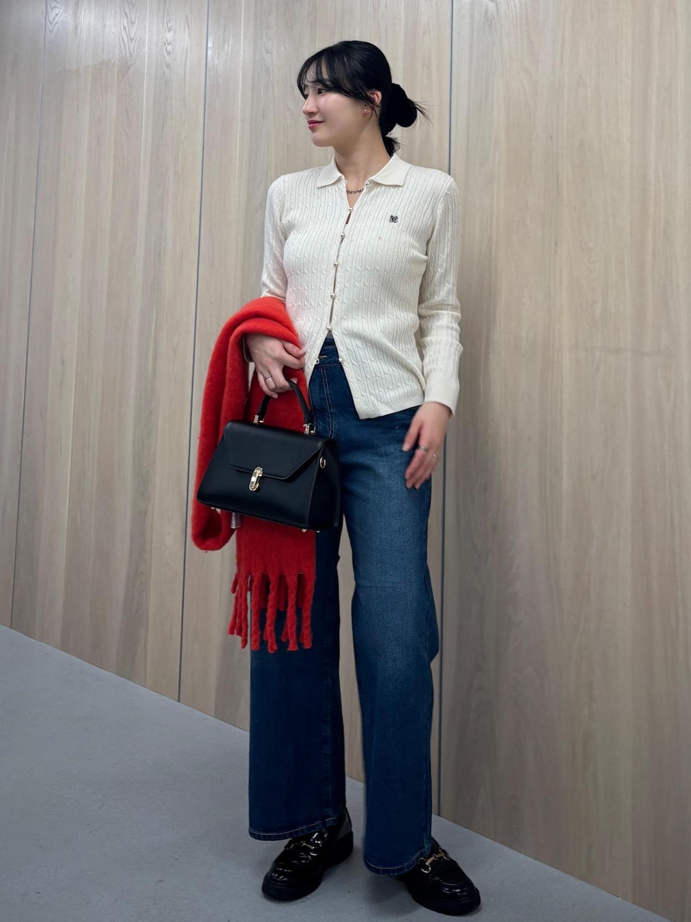 ベーシックなデニム×ポロ襟カーディガン。 カーディガンは上下のボタンを開けてスタイルアップを意識しました! 差し色な赤が映えて
