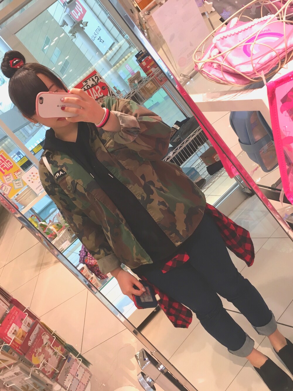 これは前回の迷彩柄のシャツに違う組み合わせでレパートリーを増やしてみました! 今回はお団子ヘアーであわせました! おだんごのときはパーカーを着ました!その方がおしゃれに見えるからw 腰にまいてるシャツもオシャレで巻きました!