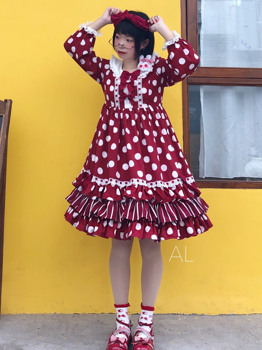 レッド系のワンピースを着用したレディースの秋コーディネートの1枚目の写真