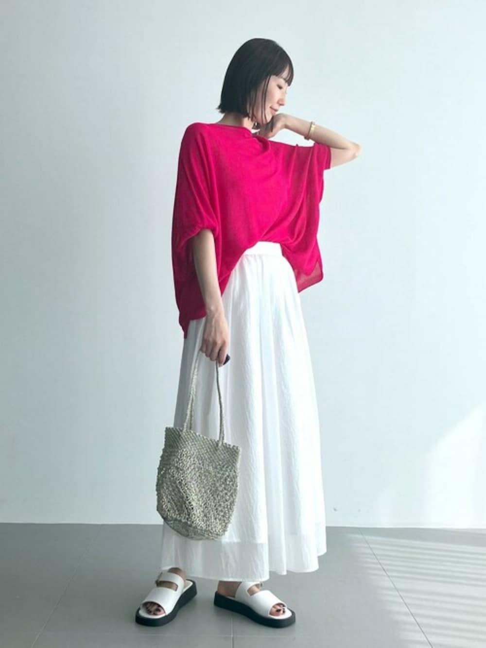 ◾️各アイテムのおすすめポイント  ̄ ̄ ̄ ̄ ̄ ̄ ̄ ̄ ̄ ̄ ̄ ̄ ̄ ̄ ̄ ̄ ̄ 【トップス】 サラッとした、サマーニット。 カラーによっては、華やかに着用◎ ドルマンスリーブが風通しよく暑い日にもおすすめ。 【ボトムス】 シアー感のある、軽やかなスカート。 清涼感もあり、きれいめでもTシャツ合わせにスニーカーなどでカジュアルスタイルにもおすすめ。 163cmでも、丈がしっかり長めにも着用◎ ※同素材のシャツでセットアップ着用も可能