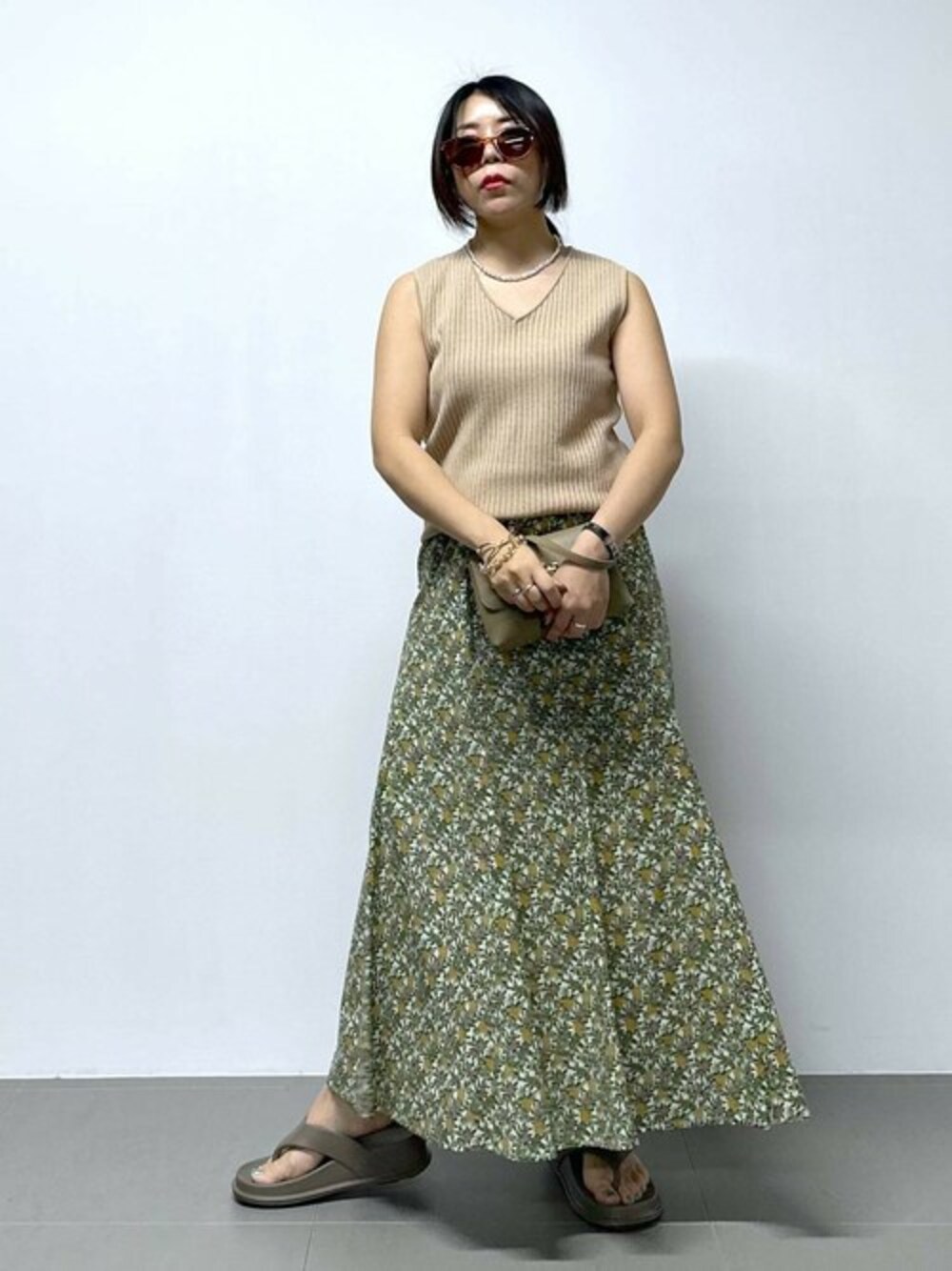 夏の柄スカートコーデ ⭐各アイテムのおすすめポイント  ̄ ̄ ̄ ̄ ̄ ̄ ̄ ̄ ̄ ̄ ̄ ̄ ̄ ̄ ̄ ̄ ̄ 【トップス】 Vネックのリブニットは、ピッタリしすぎないシルエットとさりげないラメで大人な一枚。 シンプルで着回ししやすく、オンオフどんなスタイリングにも合わせやすいです! 【ボトムス】 シルエットのキレイなフルーツ×リーフの夏らしい柄のスカートです。 ウエストゴムで履きやすい! ストレスフリーな着心地です。