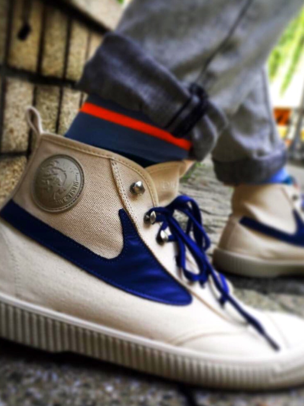 キャンバス スニーカーでお散歩🚶♂️ 天気回復しましたが、暑くなりましたね(^_^;) 手持ちのスニーカーは殆どがハイカットです、この子は靴紐の上の穴が引っかけるタイプなので脱ぎ履きし易くて⭕️(´v`o)♡