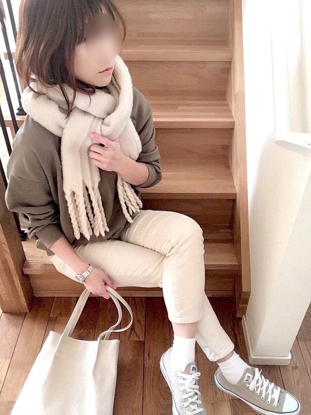 カーキのスウェットを主役に全体アイボリー系でまとめたコーデ✨ スウェットもボトムスもマフラーも各1000円以下😆 ZOZO usedにはいつもお世話になってます。 いつもイイね、お気に入りしてくださる方ありがとうございます🧚🏻出来る限りお返しします👍