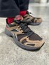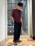 ワインレッドのTシャツと足元の淡い配色の組み合わせてみました! そこに暗いネイビーカラーのルーズスラックスパンツも合わせることで綺麗めスタイルに✨✨
