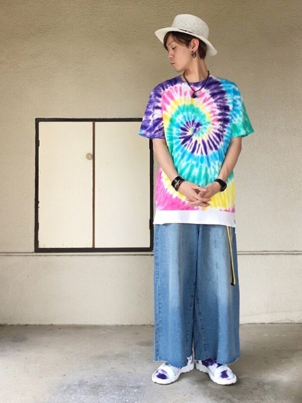 2017/08/29(火)☀️のコーデ ワイドデニム登場〜✨ キャンちゃんとマモさんが素敵に履いてて買うのを決意したレディースのパンツ‼️ たまらん太さですな〜🤤😍 夏物ラストスパートをしていた8月後半‼️ 派手なタイダイ柄は着納め。 しかし改めて言うのもなんだけど… この日は派手だったな〜🤣💦 それではまた〜😆👋