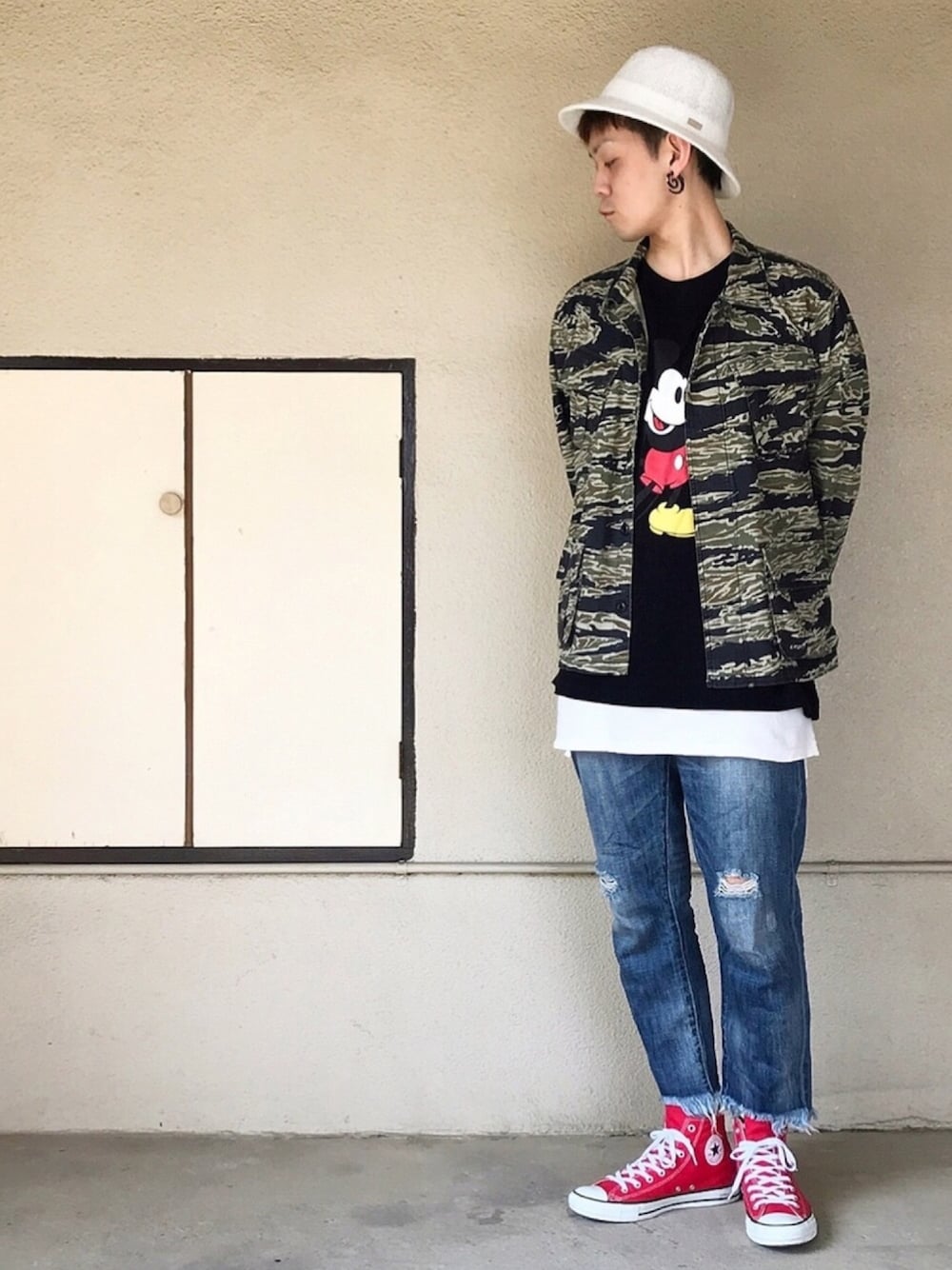 2018/04/04(水)☀️のコーデ 🐯🦆🐭❤️👟 タイガーカモ×ミッキー×赤コン 水曜日暑かった〜😅💦 それではまた〜😆👋