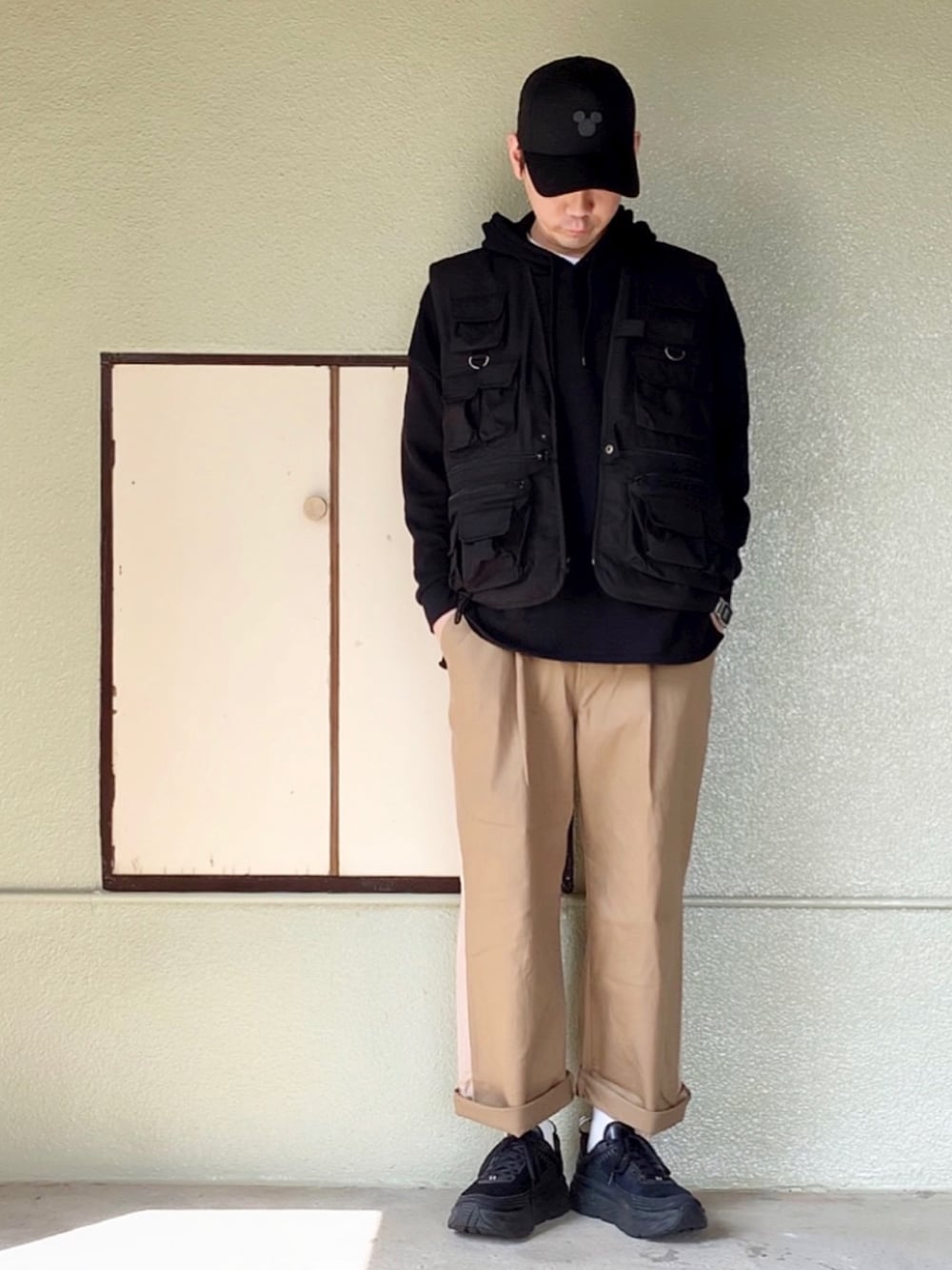 安定のベージュ×ブラック! ベストを使いたかった日🙋♂️ 同色のパーカーと合わせて、さり気なく🎵 キャップのミッキーも、さり気なく🎵🎵 GWは休む日ではなく、 いつもより頑張って働く日だと、 解釈しております🙋♂️✨(笑) それではまた〜👋😆