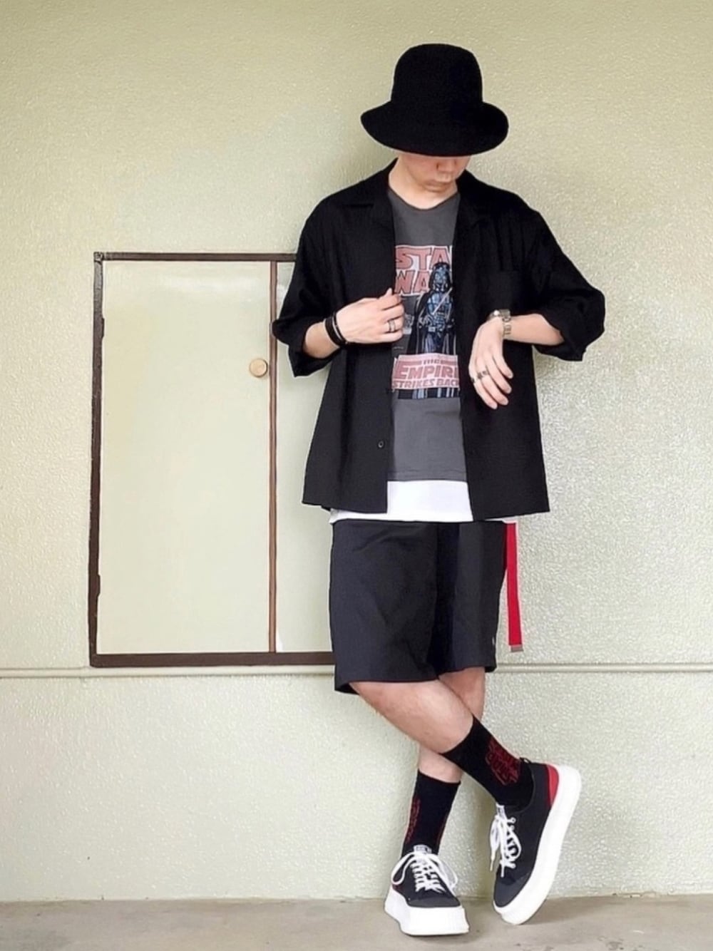 前回お話しした、お気に入りのスニーカー💙👟 気に入り過ぎて色違いも買っちゃった〜🙌😆🖤💸← ブルーも、もちろん良いんだけど、 安定のブラックも必要だよねー🤣👍 ブルーのR2-D2モデルに続きまして、 ブラックはダースベイダーモデル🖤 /▽益▽\っ-━━ ブ~ン そうと来れば、まず合わせるTシャツはこのプリント✨ 帽子も何となくダースベイダーっぽいやつ🤣(笑) ガチャベルトは、 ダースベイダーのライトセーバーっぽく赤❤️ もうひとつ新しいのはソックス🖤❤️ いつか買おうと思って先延ばしにしていたけど、 ついに買うタイミングが‼️ このスニーカーに合わせようと思って、 買ってきました〜🤣👍✨💸 短パンに長めのソックスは、 あまりやらない組み合わせなので、新鮮😍✨ 短パンには長袖のトップス合わせで落ち着かせて、 ブラックの重めな色合いの時は、 白のレイヤードチラ見せ‼️ トータルして…大満足な仕上がり✨👴🏻✨ それではまた〜👋😆