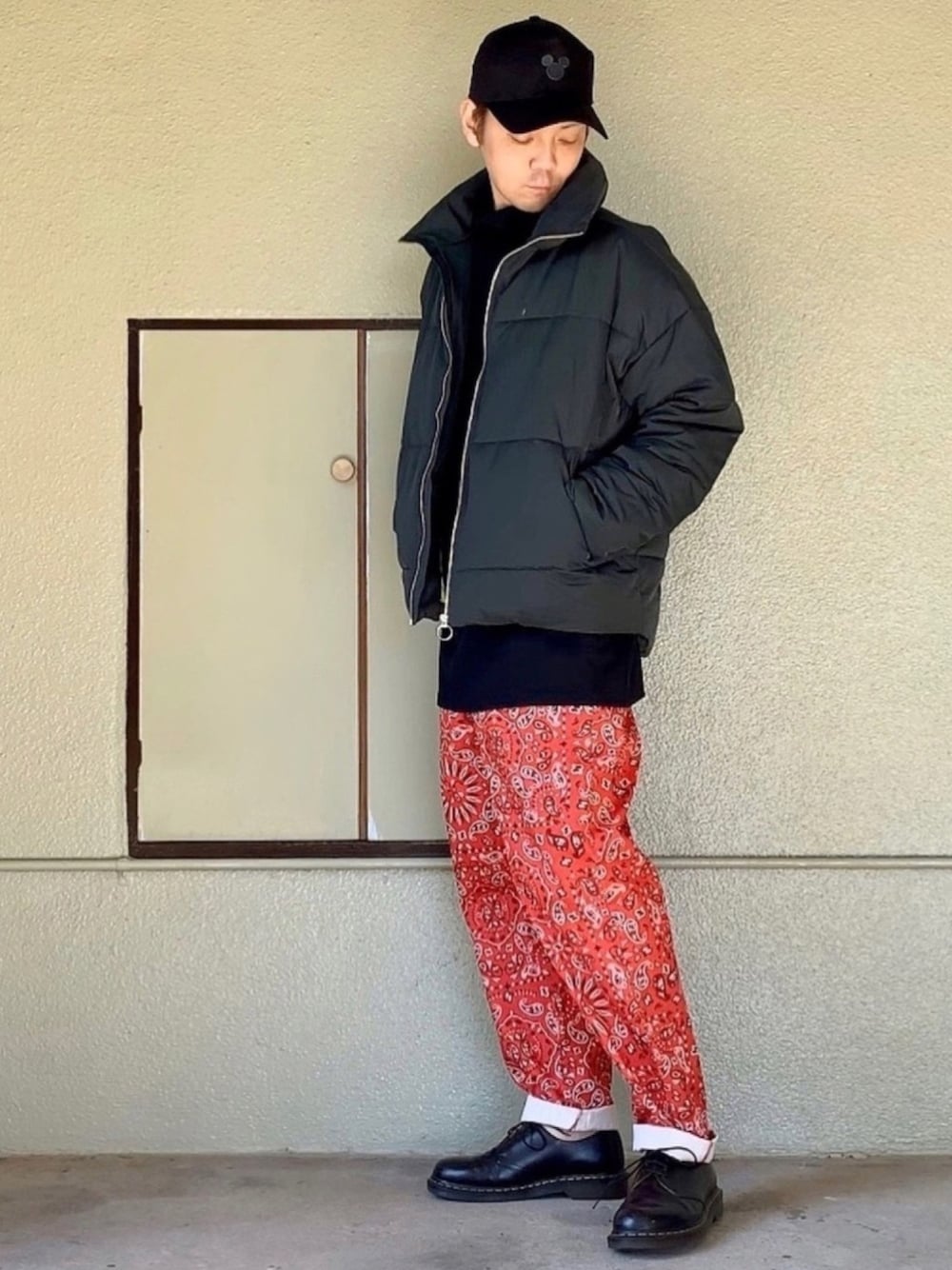 #冬アウター着回しチャレンジ🙋♂️🙋♂️🙋♂️ シンプルなアウターには、 派手なパンツを合わせたくなる〜🎵😆🎵 おニューの真っ赤なペイズリー柄のパンツ、 たまらん🤤❤️ 見ていただき、どうもありがとうございました👋😆