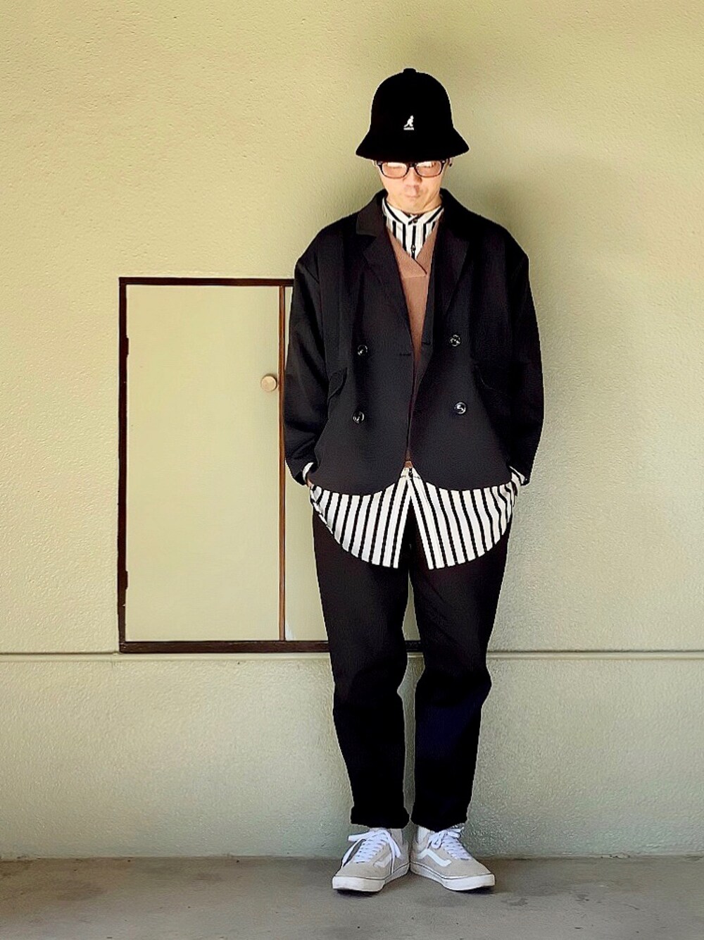 (▭-▭)✧ 黒いダブルのジャケットを使った、 セットアップ風コーデ✨ 黒なら持ってるパンツを合わせても、 簡単にセットアップ風なコーデが出来ちゃう🎵 レイヤードで軽い色を足して、 重くならないように着崩すのが好き🙋♂️❤️ 見ていただき、どうもありがとうございました👋😆