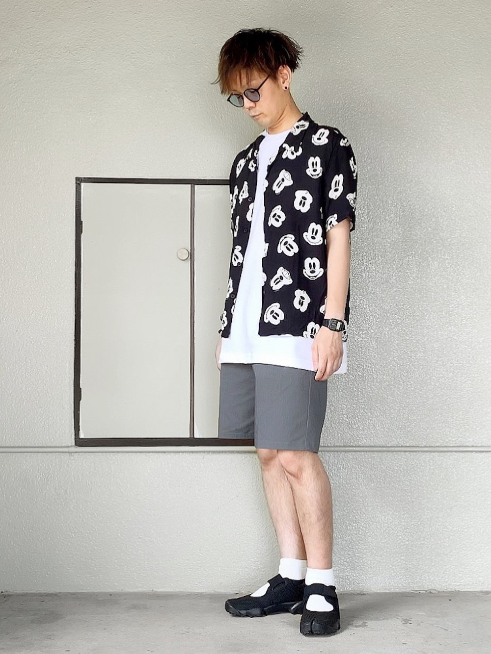 短パンコーデを、 落ち着いた感じに見せようと思ったら、 モノトーンとシャツ合わせだね😎✨ …なんて言ってみたけれど、 そんな気はさらさら無い🤣🎵 お気に入りの柄シャツを主役に🐭✨ エアリフトにはやっぱり足袋ソックス合わせが、 履き心地良い〜🤤❤️ 見ていただき、どうもありがとうございました👋😆