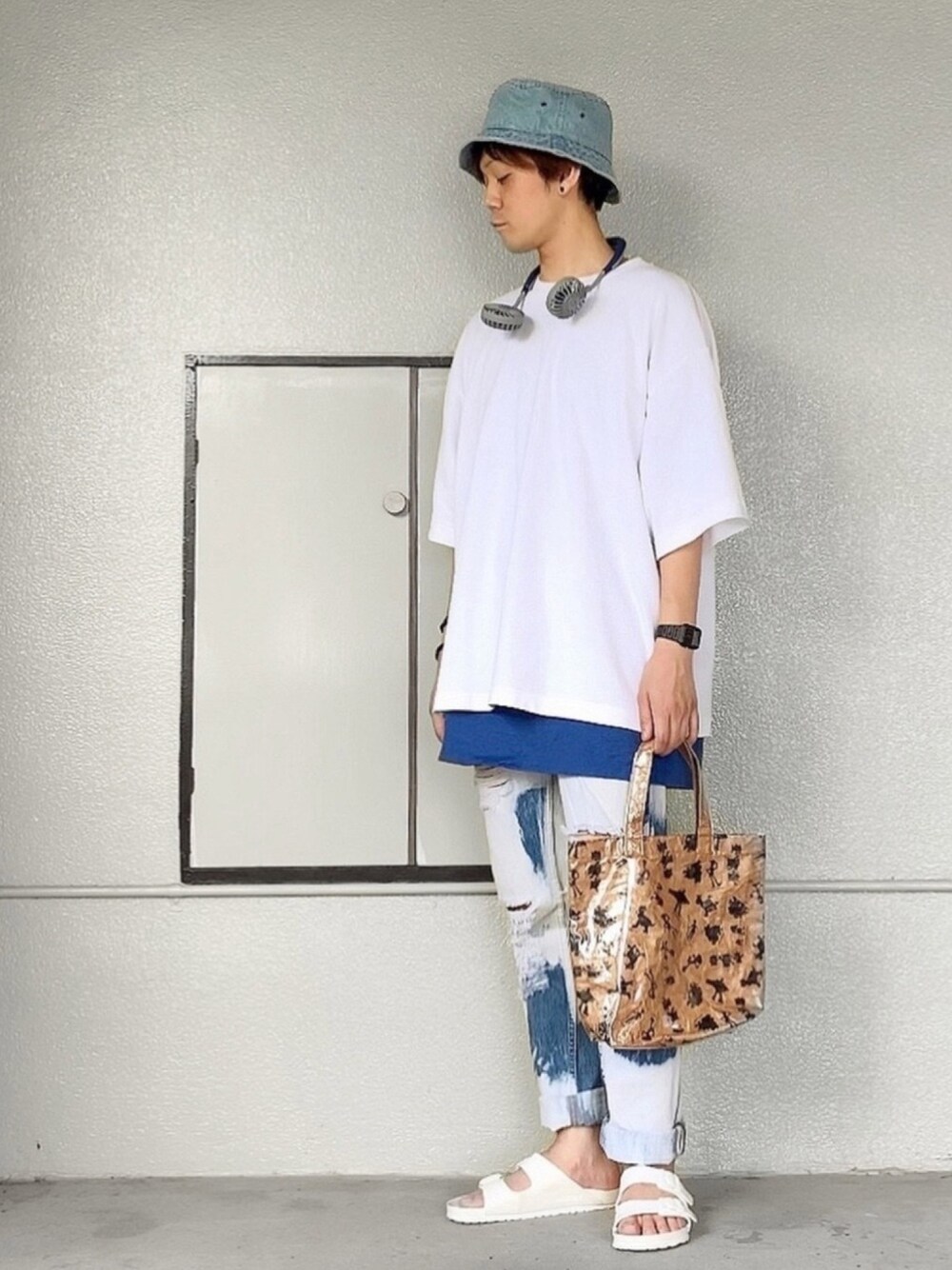 定番の白Tシャツ×デニムのスタイルを、 色々とアレンジ💙 ビッグサイズのTシャツをレイヤードし、 ダメージとブリーチが、 ポイントになるデニムでアクセント🎵 足元は夏らしくサンダル👡 帽子はパンツと合わせてデニム素材👖 扇風機の色も全体と合わせて統一感💙 そして手に持った、おニューのバッグ👜✨ トートバッグを探していたところで、 可愛いのを発見❗️😍✨ ポチッと購入して届いてみたら… 思ってたよりサイズも可愛いかった〜🤣💦 ちなみにお値段は可愛くな…🙊💸 可愛いバッグの柄や素材感は、 商品ページを見ていただくと、 分かりやすいかもしれません🙇♂️ 見ていただき、どうもありがとうございました👋😆 いいね、お気に入り、フォロー、フォルダインも どうもありがとうございます🙇♂️❤️