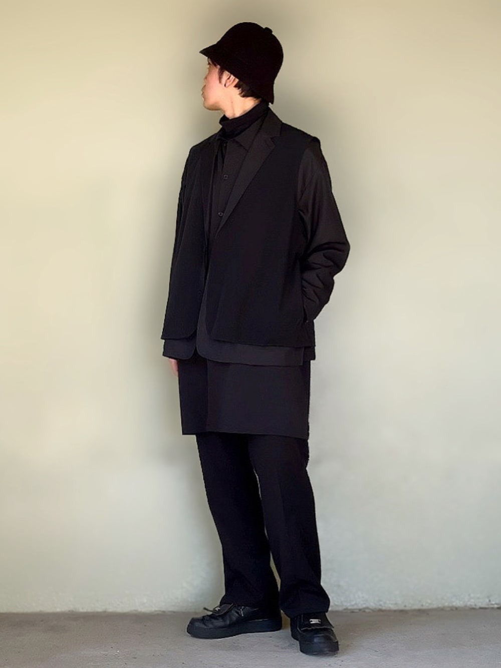オールブラックレイヤードコーデ😎🖤 ハイネックのカットソーに、 ロングシャツを重ねて、 テーラードジャケットを合わせる! さらにその上からベストまで重ねちゃう🤣👍 レイヤードを楽しんだコーデ🎵 見ていただき、どうもありがとうございました👋😆 いいね、お気に入り、フォロー、フォルダインも、 どうもありがとうございます🙇♂️❤️