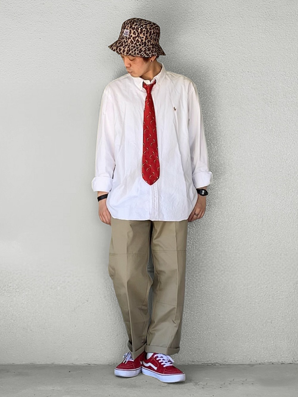 白シャツにベージュのチノパン合わせの、 シンプルスタイル🎵 ポイントにネクタイとスニーカーで赤差し❤️ それでもポイントが足りないと思ったのか、 ヒョウ柄のバケットハットで更なるアクセント🤣❤️🐆 見ていただき、どうもありがとうございました👋😆 いいね、お気に入り、フォロー、フォルダインも、 どうもありがとうございます🙇♂️❤️