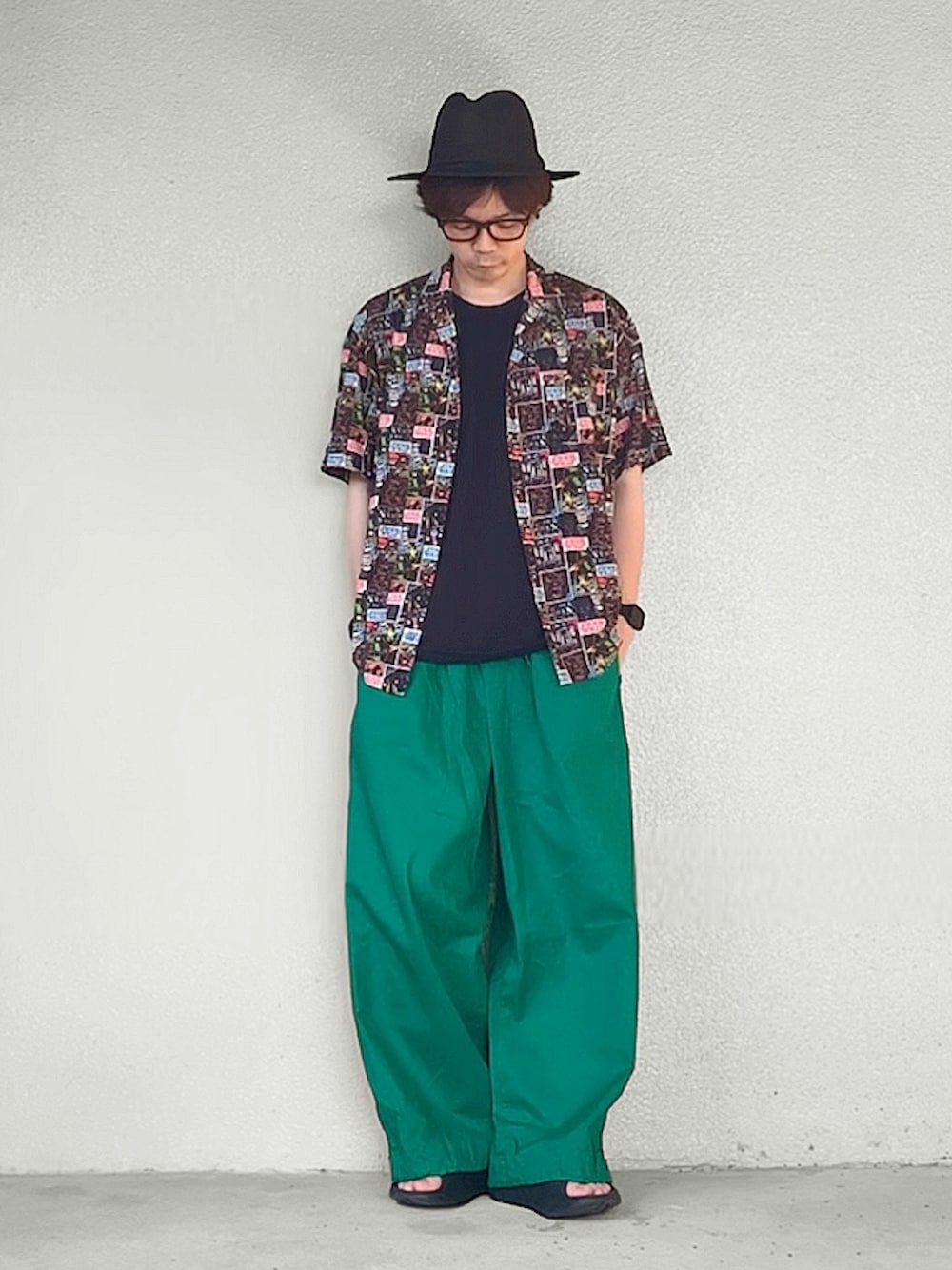 グリーンパンツコーデ🙋♂️💚 柄シャツと麦わら帽子とサンダル合わせで、 夏らしく☀️😎🏝️ 見ていただき、どうもありがとうございました👋😆 いいね、お気に入り、フォロー、フォルダインも、 どうもありがとうございます🙇♂️❤️