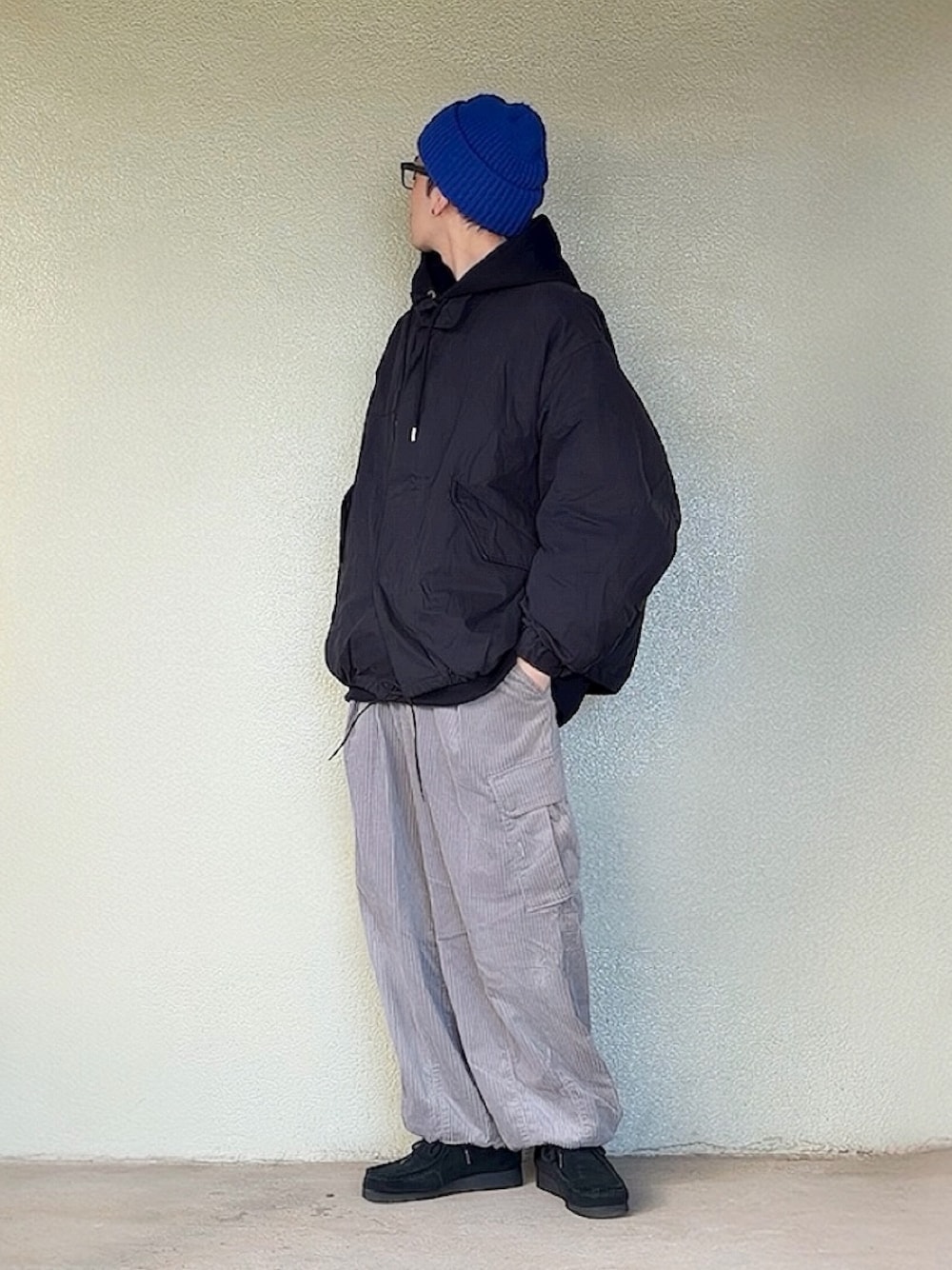 ブラックアウターコーディネート🙋♂️ フード付きのアウターの気分を、 パーカーとのレイヤードで試してみる。
