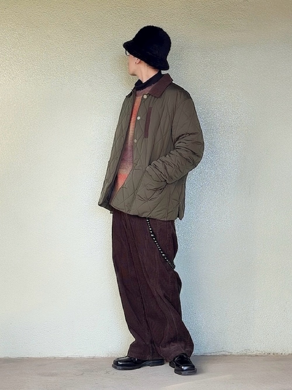 キルティングジャケットコーディネート🙋♂️ 襟とパンツを合わせて🪵