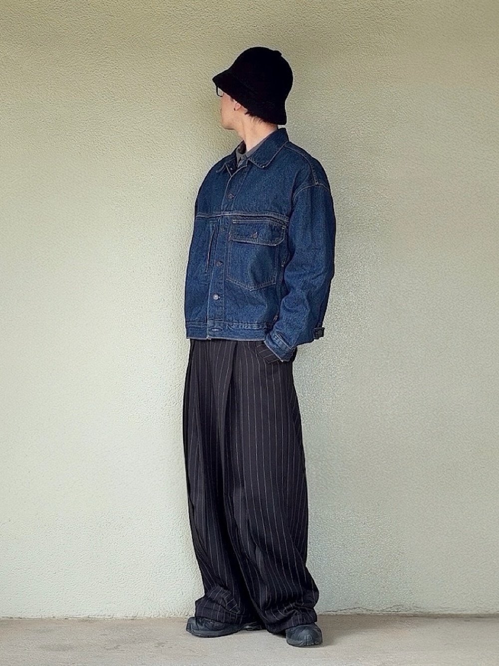 デニムジャケットコーディネート🙋♂️ ストライプスラックスと合わせてきれいめカジュアル🎵
