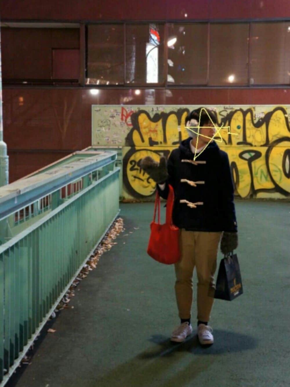 ダッフルデビュー。 シンプルスタイルに赤バッグで差し色。