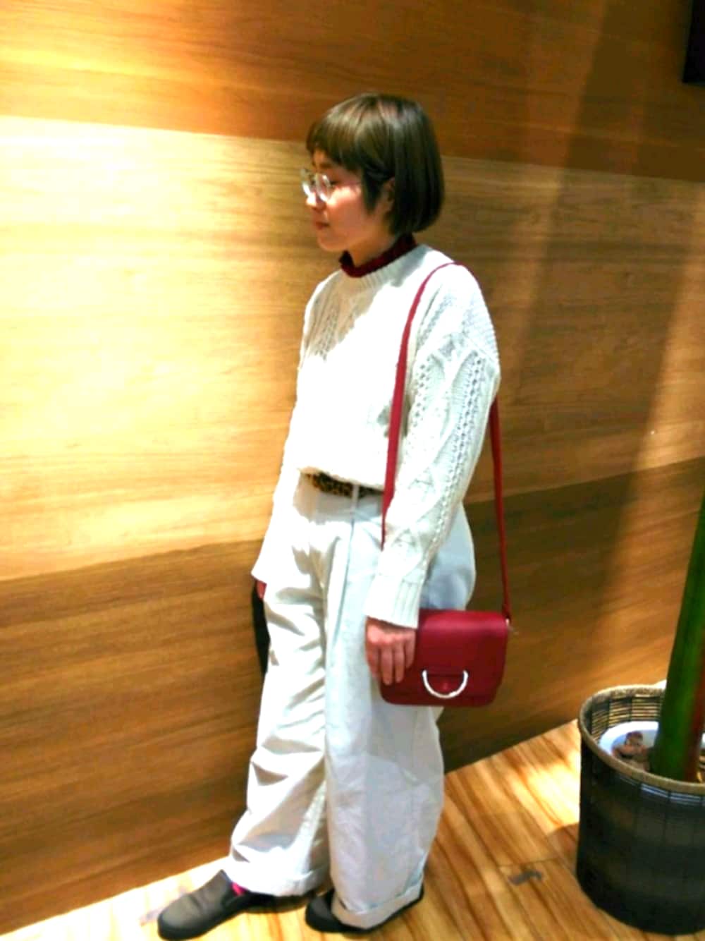 オールホワイトコーデ✨ 小物は赤で💡 ケーブルニットは一目惚れ😍 コーデュロイパンツは少し前にアップしてた色違い😁 気に入り過ぎて、色ち買いしちゃってます笑