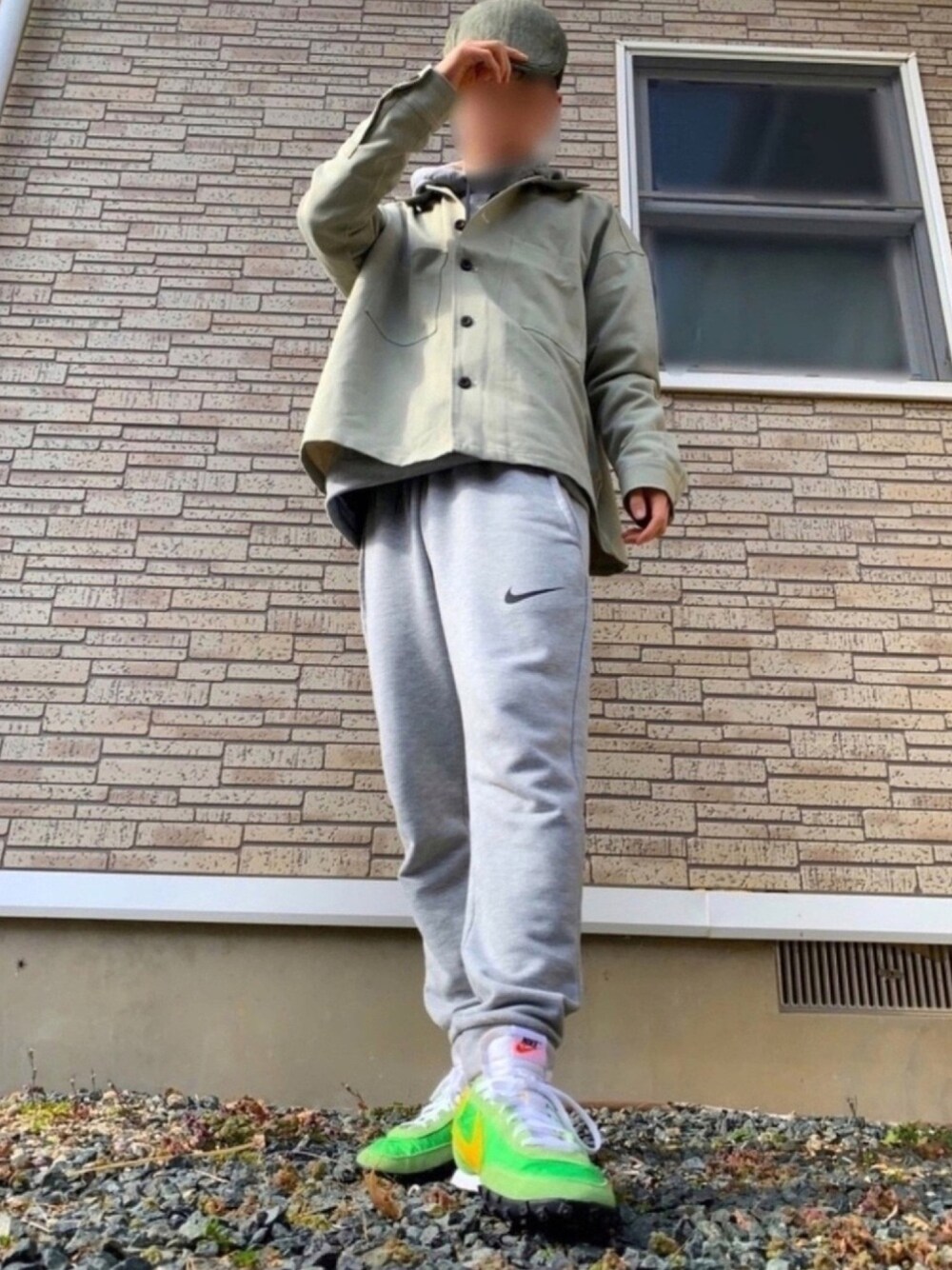 グリーン系のスニーカー、グレー系のスウェットパンツを着用したメンズの春コーディネートの1枚目の写真