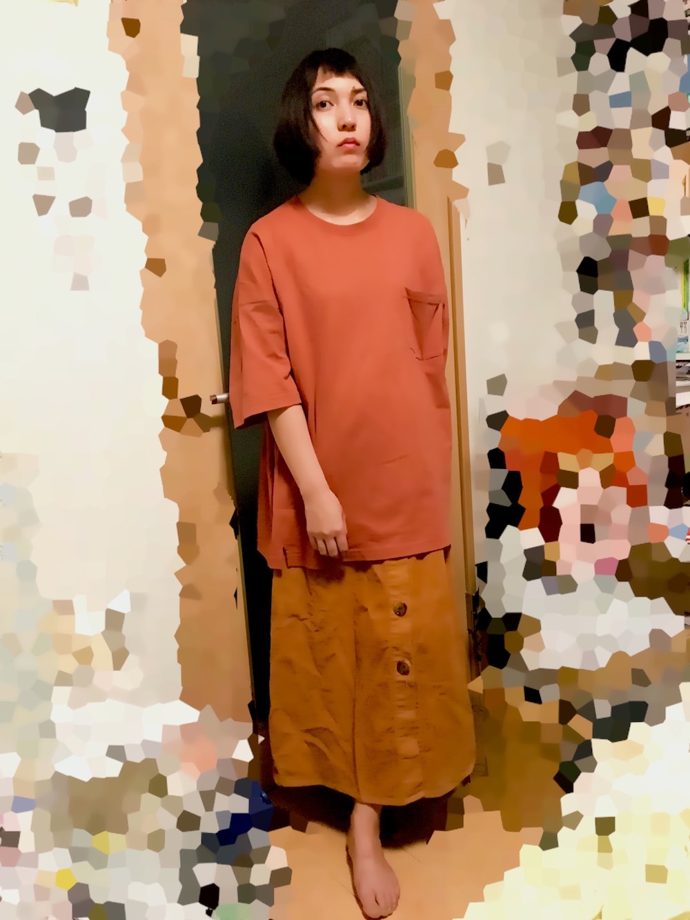 一足先の秋気分。 茶×オレンジのワントーンコーデに赤リップでポイントを。 アイメイクとチークにはナチュラグラッセのクレヨンUVリップ アプリコットオレンジ。 赤リップは懸賞で当たったローラメルシエのルージュエッセンシャル。 ビッグTはGUのメンズXL。