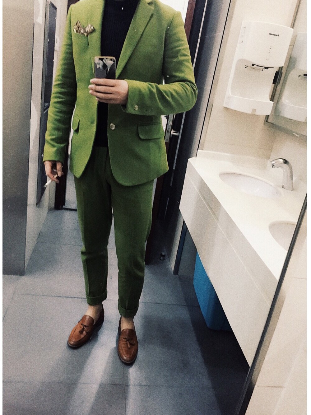 绿色系西服套装搭配暖色系口袋巾和穗饰莫卡辛鞋显得人更有精神,视觉上拉高身材比例