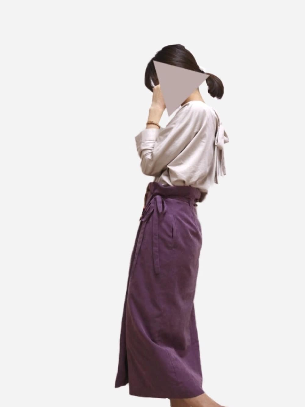 ご覧いただきありがとうございます🙏 (マイページ充実のため連投失礼します) パープルには黒を合わることが多いのですが、淡いベージュと組合せると柔らかさが増してこれもいいなぁと🙆♀️ 色物のスカートを履くと気分が上がりますね☺️ トップスは光沢感があって着るだけでキレイめコーデの完成です😎✨