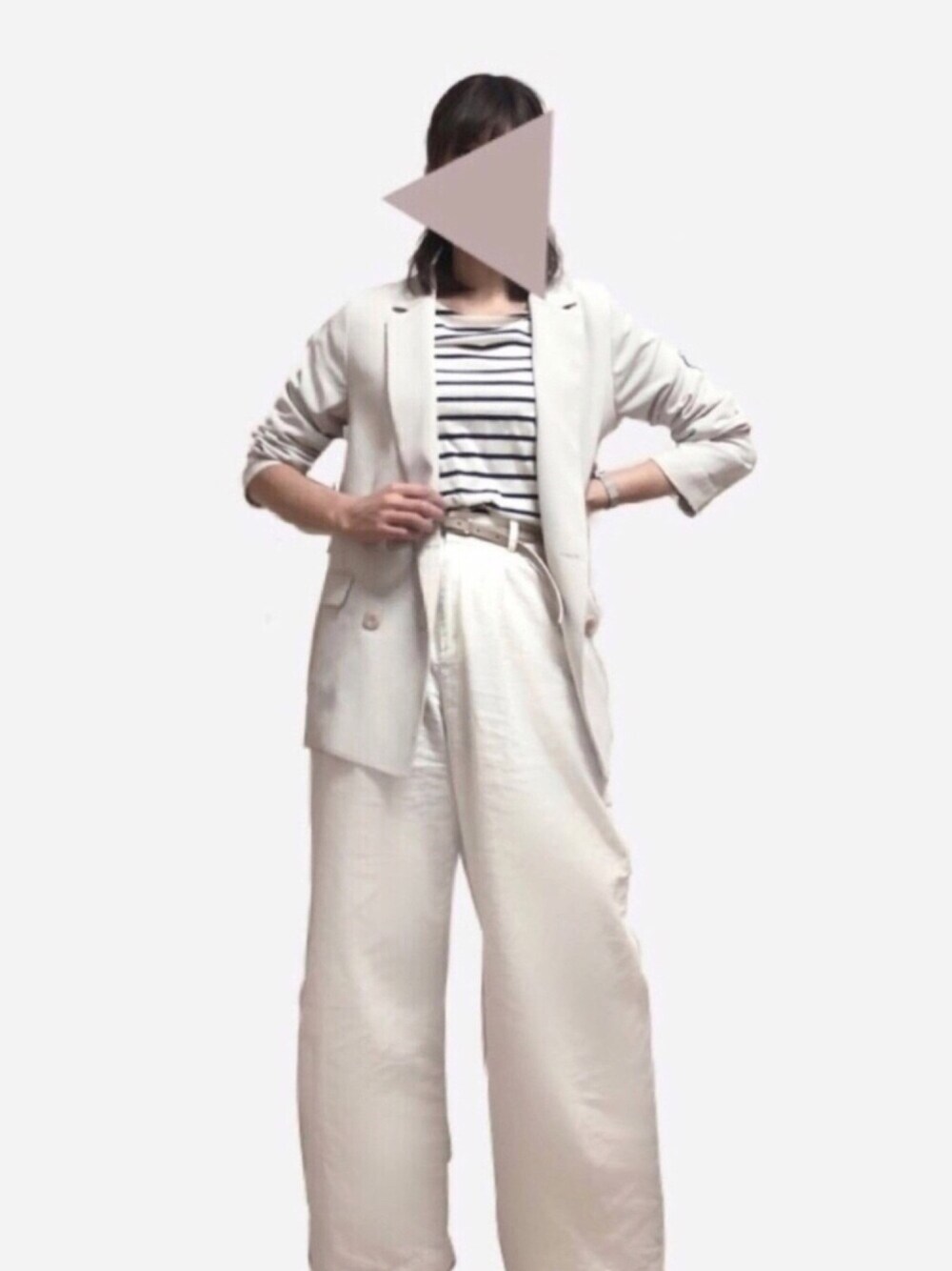 ご覧いただきありがとうございます🙏 ジャケット×ワイドパンツ ジャケットがオーバーサイズで丈も長いからワイドパンツとの相性ばっちし◎ テーラードジャケットとボーダートップスの組合せが個人的に好きです😌💕