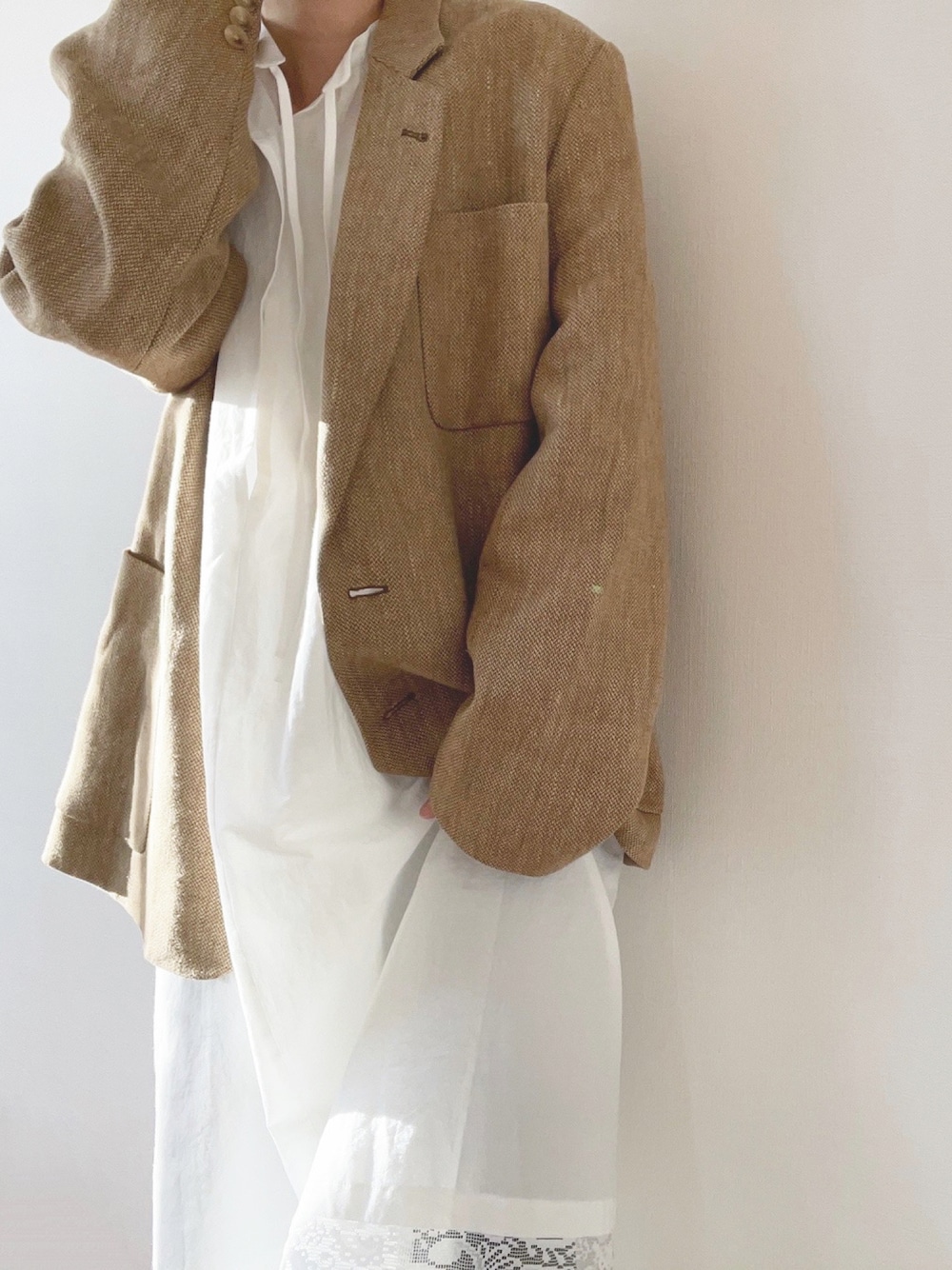 白レースワンピにリネンジャケット。 どちらも春といえば、なアイテム。 ig▶︎ hanauta__home コーデの他、カフェ・インテリアなども投稿しています𓅯