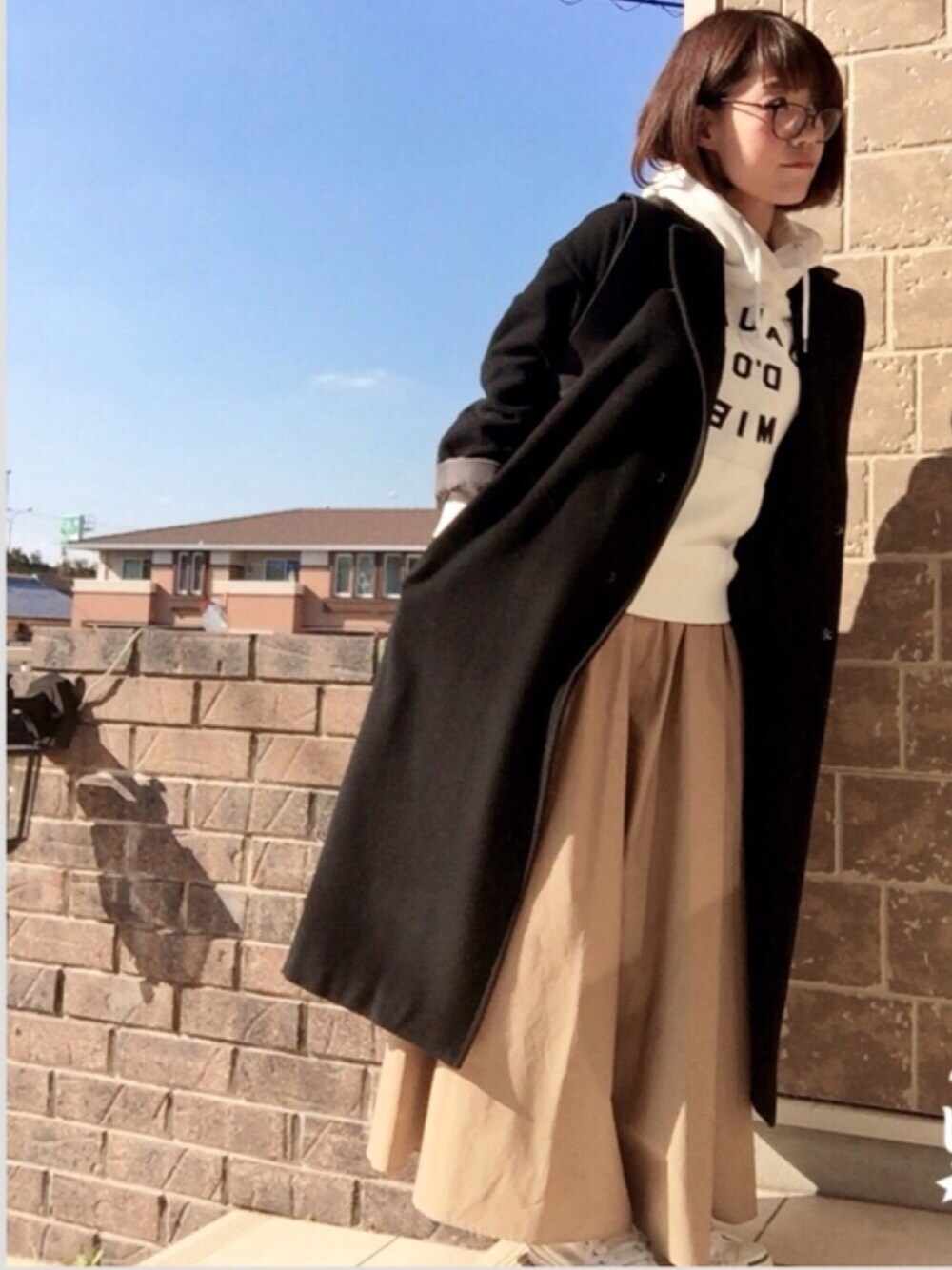 白パーカー+ベージュスカートでちょっとだけ春。でもまだまだ寒いのでコートは必須です!