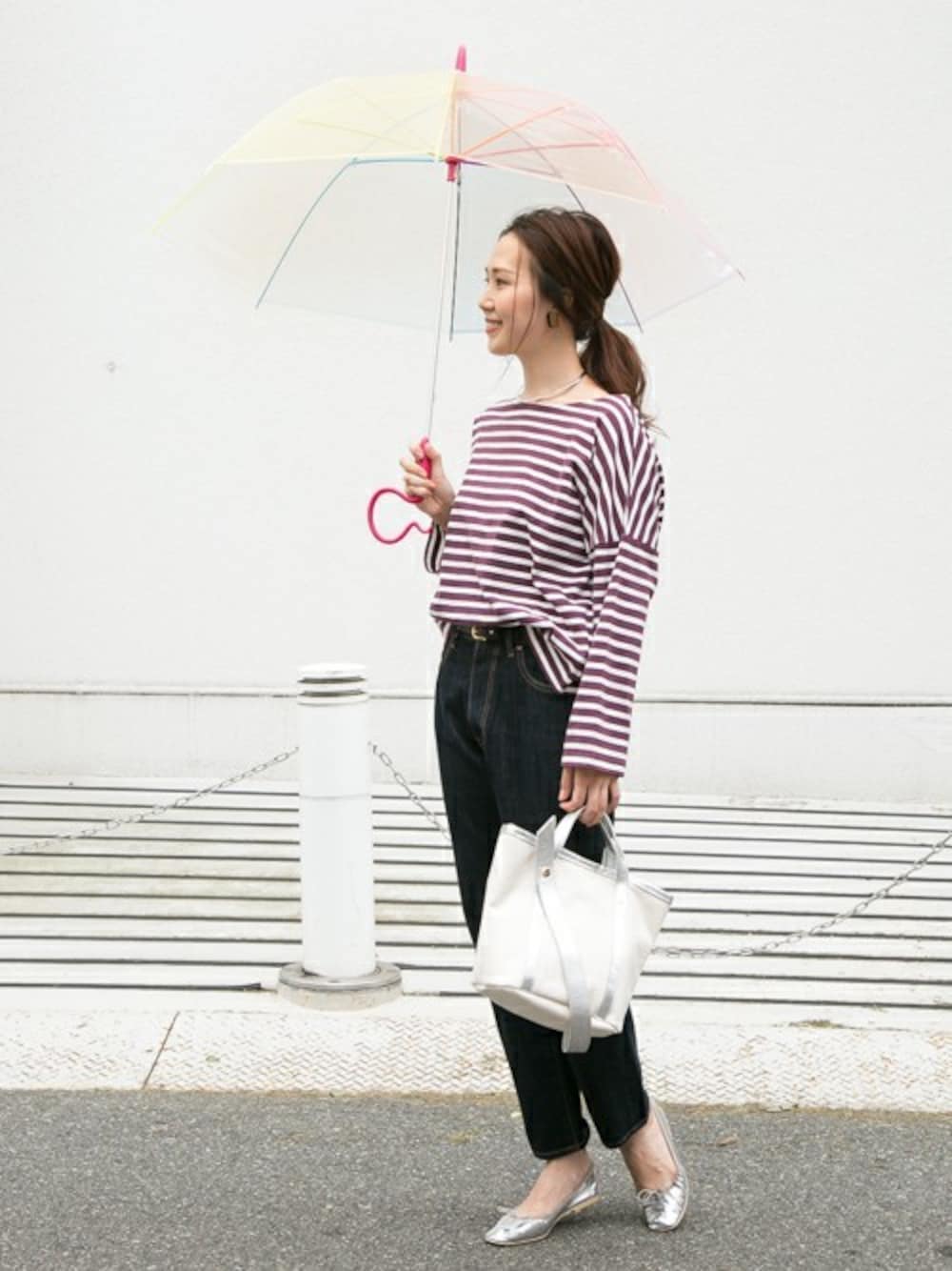 定番アイテムのボーダートップス。 深みのあるカラーがこなれた印象◎ バレエシューズと合わせてフレンチな印象に仕上げていました^^ 傘は大人気のEvereonの無地カラフル。 たくさん種類のあるEvereonですが、迷ったらこれを選ぶと間違い無です!
