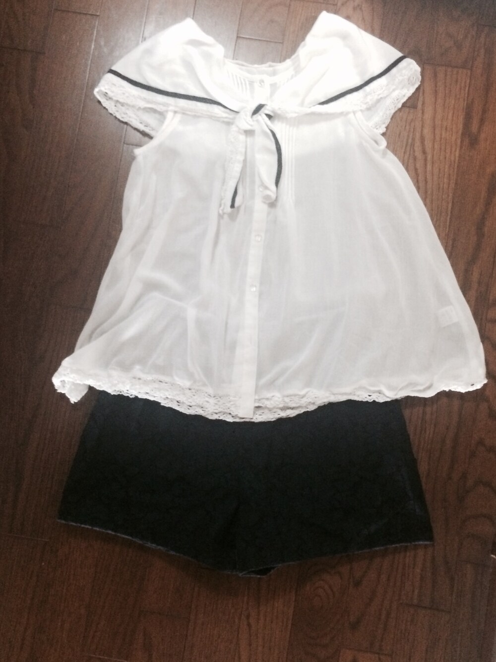 マリンスタイル♪ ブラウスの襟は外してストールにもなります。 肩が隠れる感じが可愛いのです。 キュロットスカートはハリのあるしっかりした素材で、ふわりとしたシルエットになり、太ももカバーしやすいです。