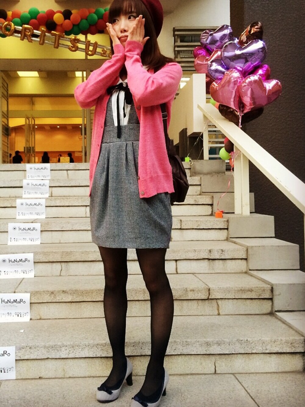 秋っぽく千鳥格子のサス付きスカートをメインに考えました。 ブラウスのリボンは、白と黒で悩んだけど、黒に。 ハイウェストスカート+引き締め効果を狙った黒ストッキング+甲浅めのパンプスで縦長シルエットに。 ベレー帽とカーディガンで、可愛らしさをプラスしました。 学園祭コーデ