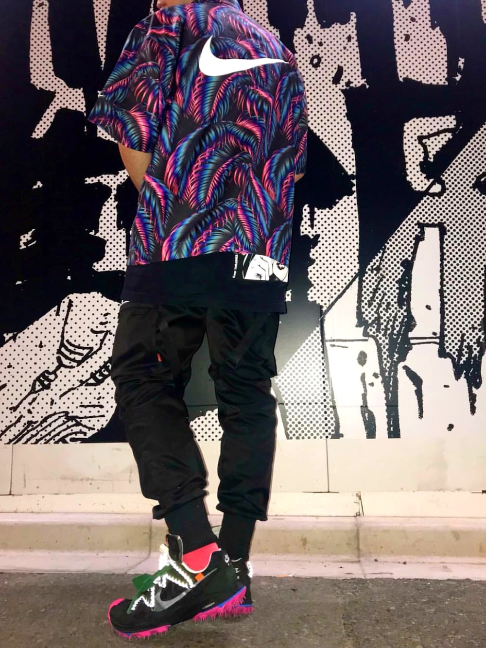 パープル系のシャツ/ブラウス、ブラック系のTシャツ/カットソー、パープル系のスニーカーを着用したメンズの夏コーディネートの1枚目の写真