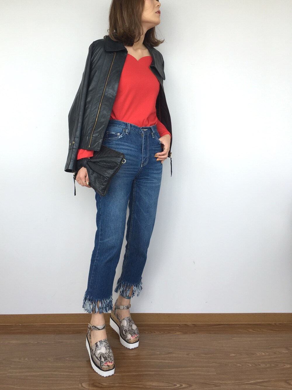 赤い❤️ハートネックに、パイソン🐍シューズ。