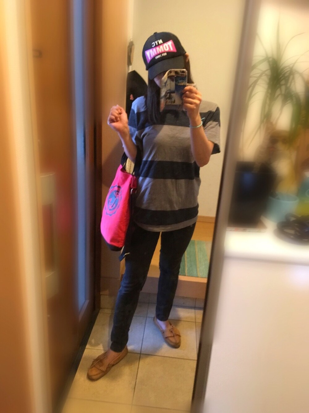 お天気なので、 スポーティーコーデ♫ Tシャツは、メンズを着用〜(^^) capは、ピンクの差し色、バックは、レッドにして、女の子らしさも忘れずにしてみましたっ(*゚▽゚*)