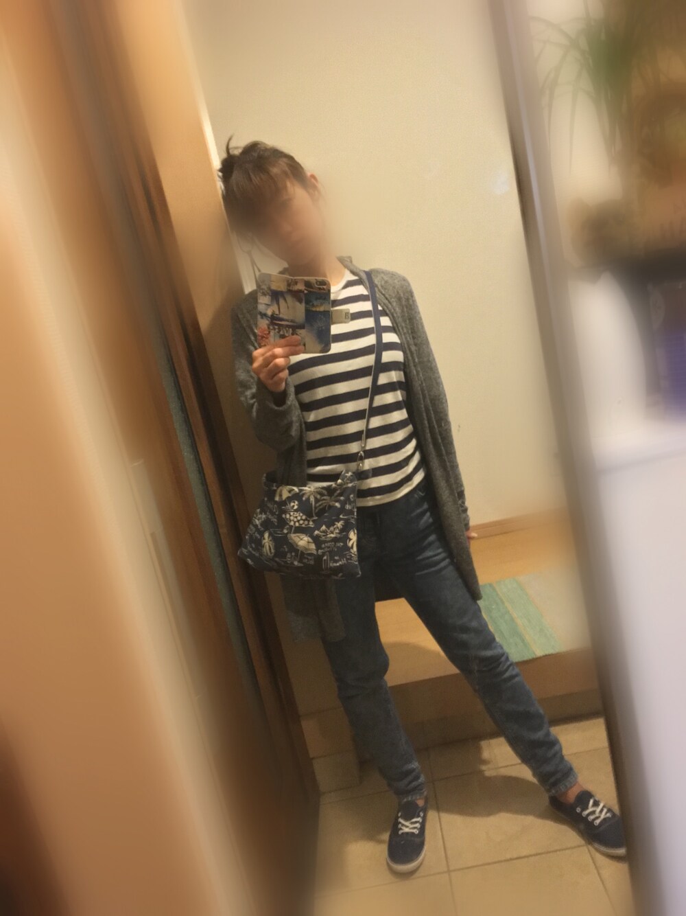 サーフ系カジュアルコーデ♡〜お仕事用〜 無印のボーダーロンTは、ヘビロテ。着心地抜群なので、ボーダー2色、無地2色持ってます。 スッキリするように、三色でおさめてます。 つまらないので、バックは、アロハ柄。クラッチバックにもなります(*´∇`*) デニムパンツは、色落ちで〜〜♡