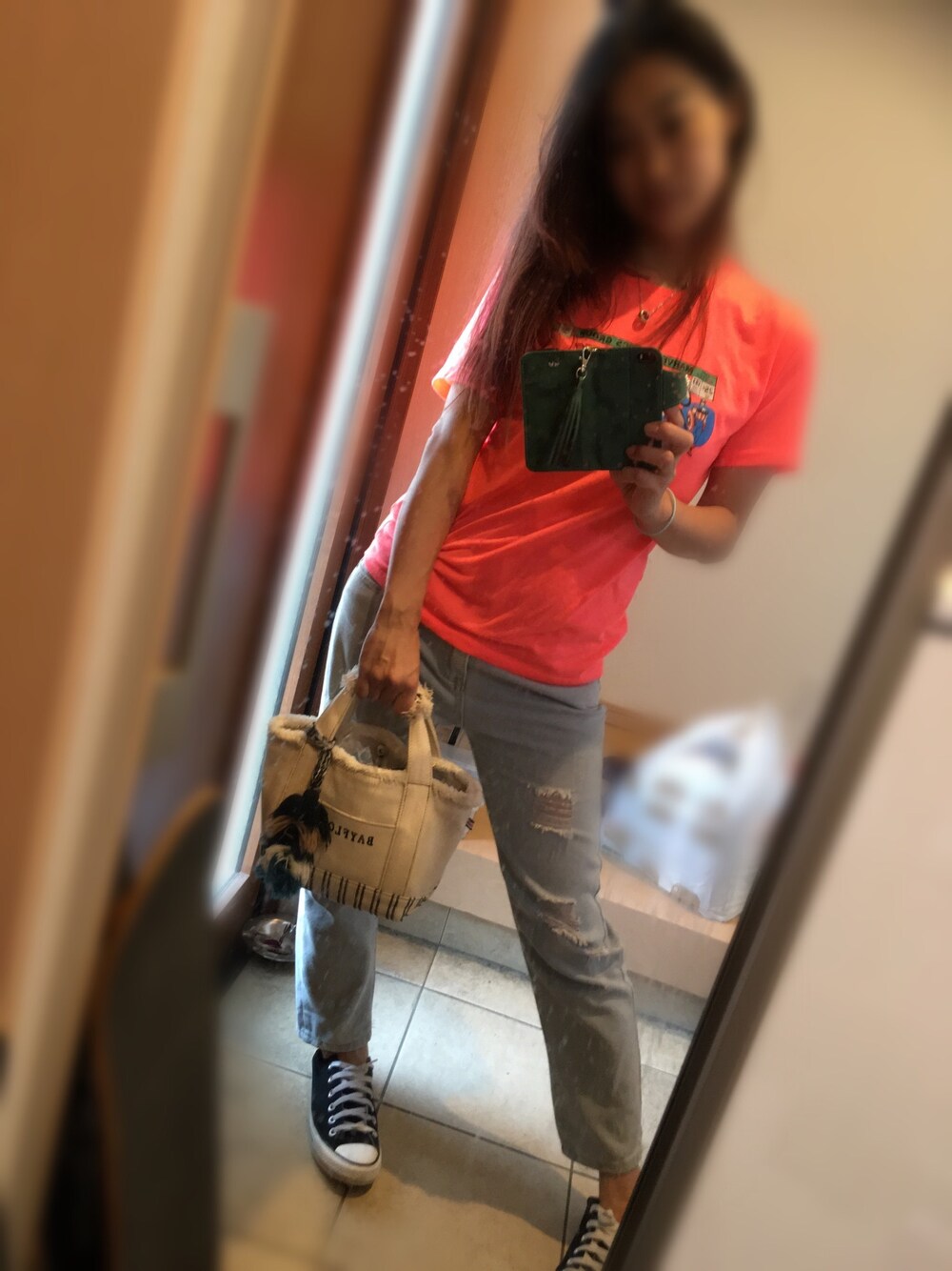 カジュアルday♡♡♡ カジュアルな中に、女の子らしいピンクTシャツ♡ Tシャツが主役なので、あとは控えめカラーでさわやかにしてみました〜〜(o^^o)