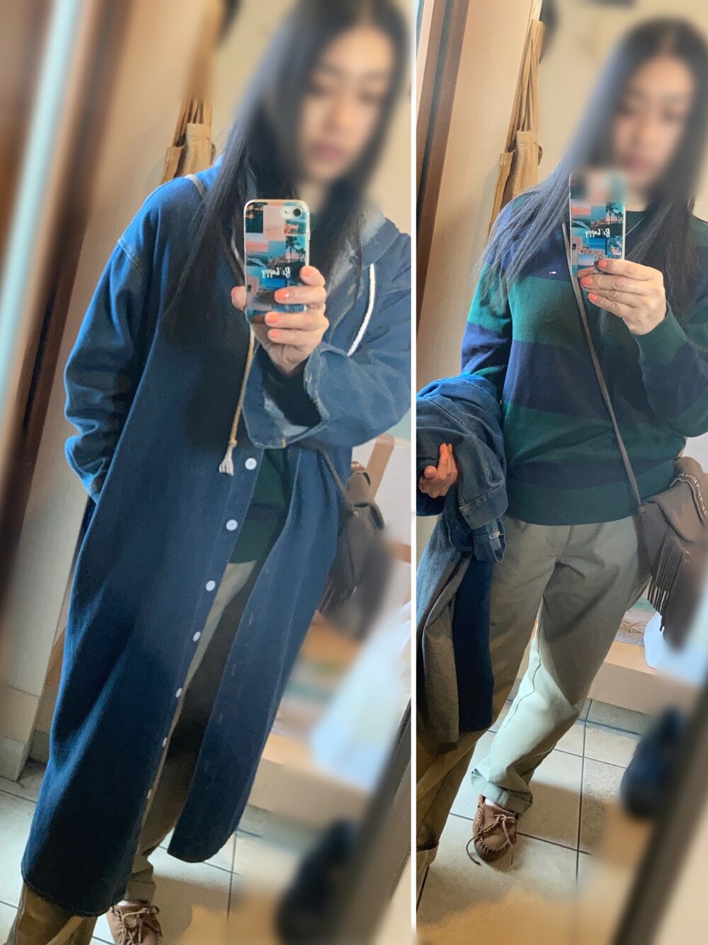 春のカジュアルコーデ♡ ディッキーズのメンズチノパンと、 トミーのメンズニットで、きれいめカジュアルに〜♫ デニムのロングトレンチコートは、 1枚で決まるから、お気に入りです♡
