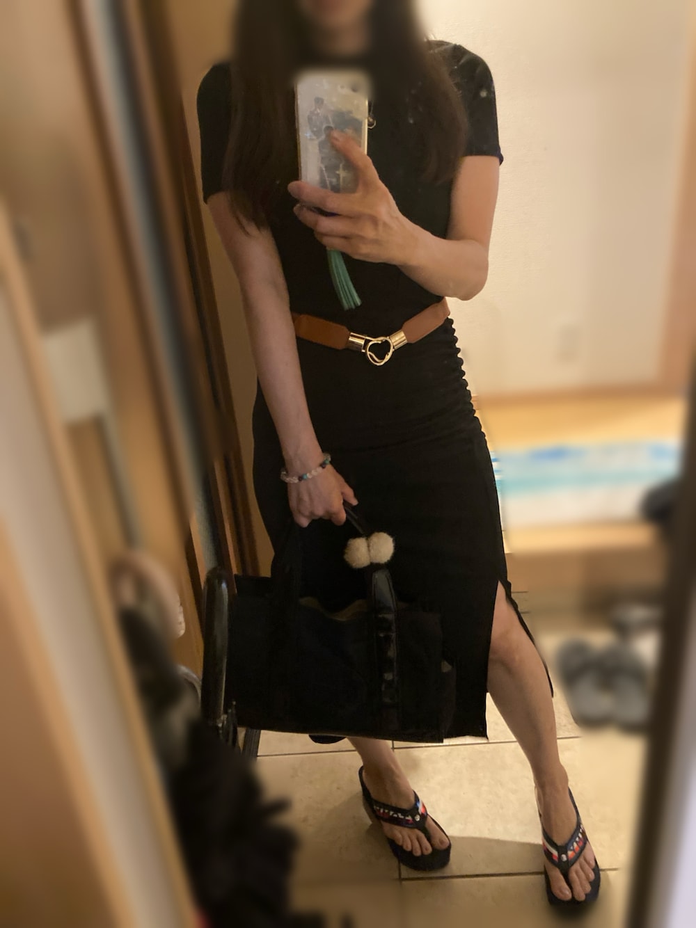 ブラックのシンプルワンピース。 アクセントにベルトをオン♪すると、 足長効果(o^^o)v バックもシンプルに。 サンダルは、厚底にしてみましたー♡