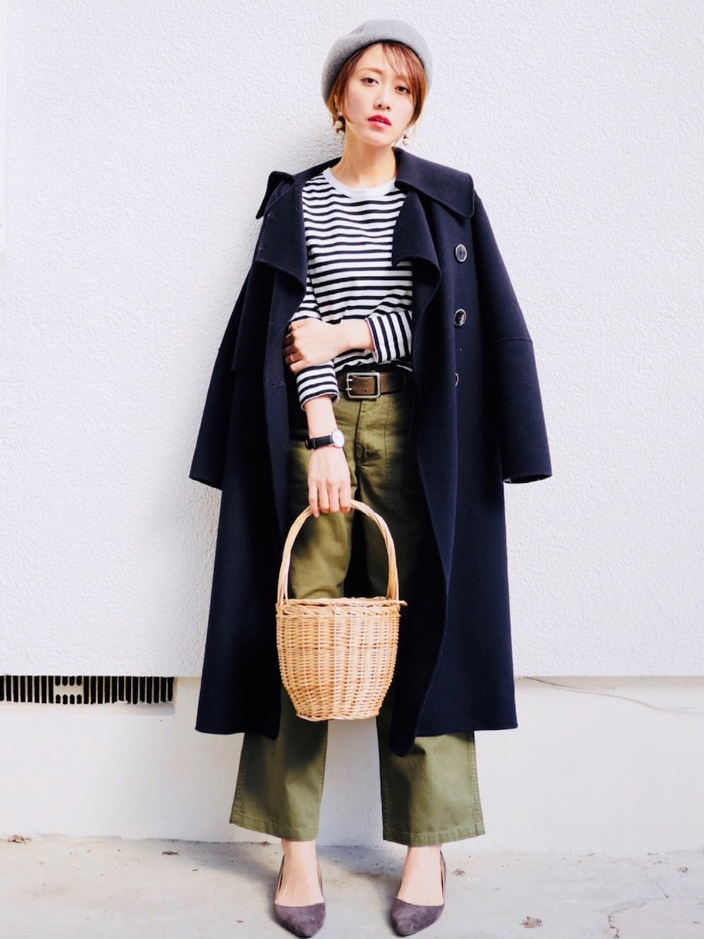ungridのベイカーパンツ Sサイズにしてみたらいい感じ💓 ちょっと短めだけど、それもまた可愛い💕 ネイビーのトレンチコートでフレンチマリン⚓️ ベレー帽、かごバッグ…beautyandyouth ボーダーT…forkandspoon ベイカーパンツ…ungrid コート…lecielbleu グレーパンプス…アウトレットシューズ、menue