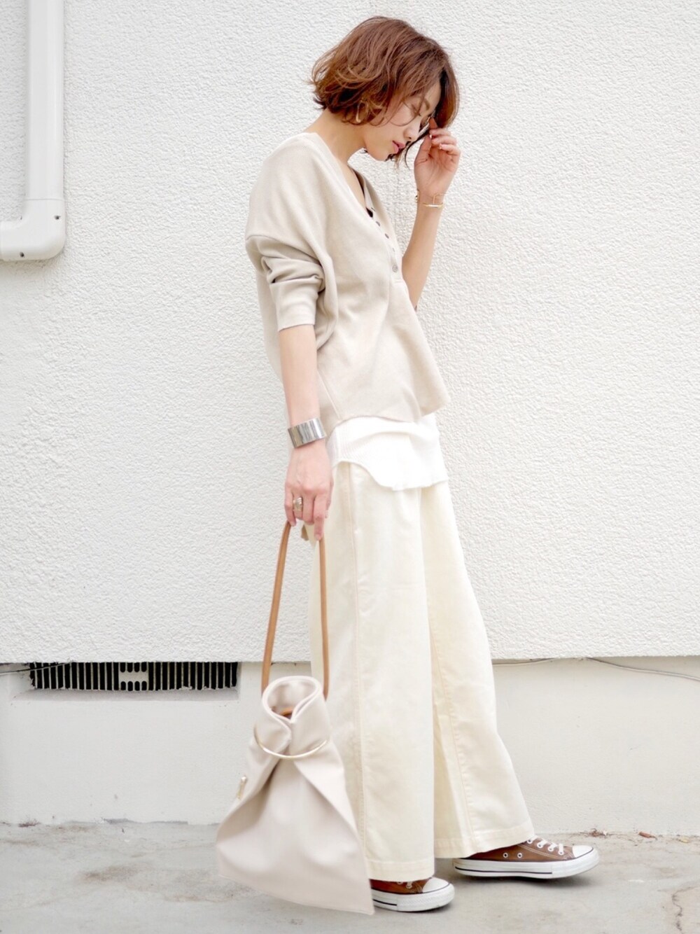 可愛い上にフワフワ柔らかくて着心地最高なヘンリーネックT🤤💖 オフホワイト〜アイボリー〜ベージュのワントーンコーデ🍂 このバッグちょっと重め💦 ヘンリーネックT…gallardagalante タンクトップ…FREAKS STORE ワイドパンツ…LAKOLE バッグ…qualite シューズ…converse