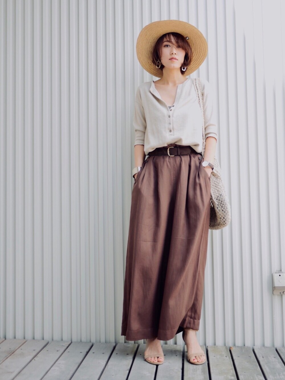 ちゃいろ🧡 ヘンリーネックT…gallardagalante パンツ…moussy サンダル…menue バッグ…Maison bengal ハット…La maison de Lyllis
