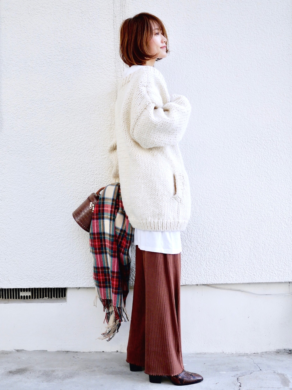 ロングTシャツにリブニットワイドパンツパンツにカーディガン。 楽チンスタイルで友達の家でのんびりおしゃべり😋☕️ ロングTシャツ…holiday カーディガン…TODAYFUL ニットパンツ…merlot バッグ…キャセリーニ ストール…D-HOLIC ブーツ…ZARA