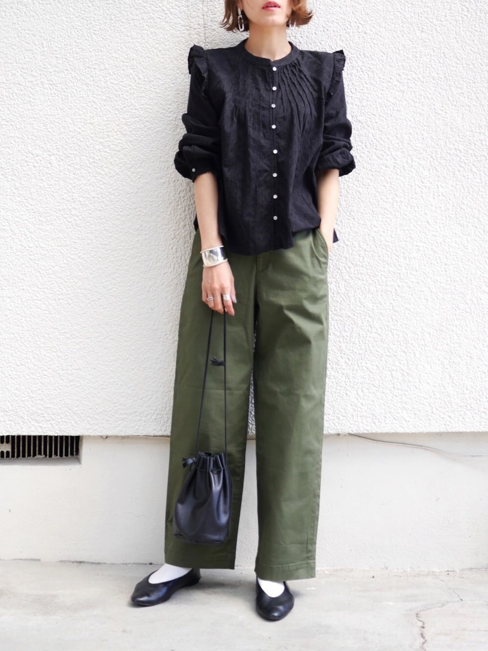 ZARAのブラウス❤️ コントラストギュピールレースシャツ サイズはLです。 わりとしっかりとして厚みのある生地です。 ユニクロのハイウエストチノワイドストレートパンツはワンサイズ上げて少し落として履いています☆ ブラウス、バレエシューズ…ZARA バッグ…the case