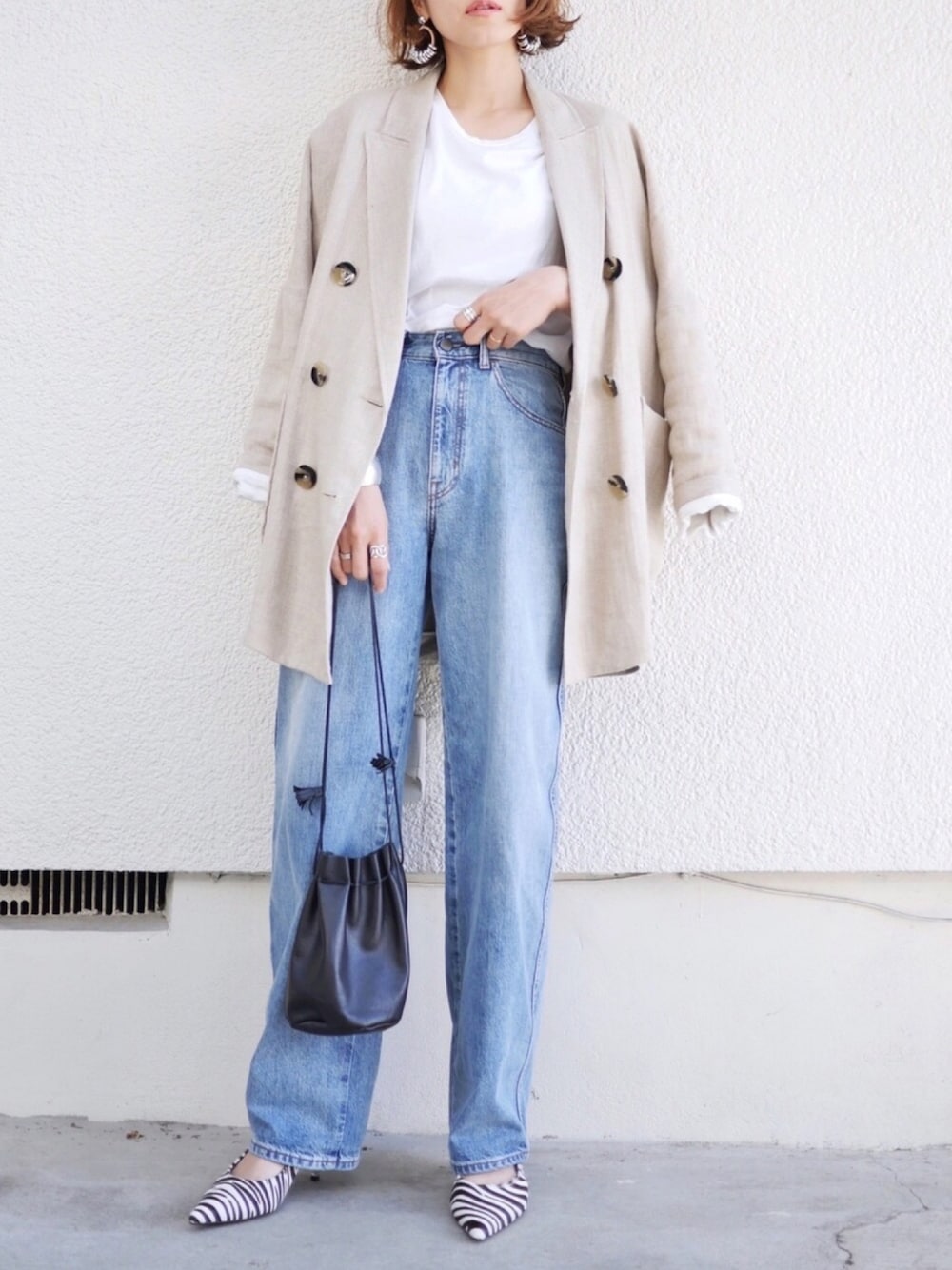 白T×デニムにリネンJK ☺︎ ゼブラ柄のパンプスがアクセント🥿 白T…hanes デニムパンツ…UNIQLO U JK、パンプス…ZARA 巾着バッグ…THE CASE
