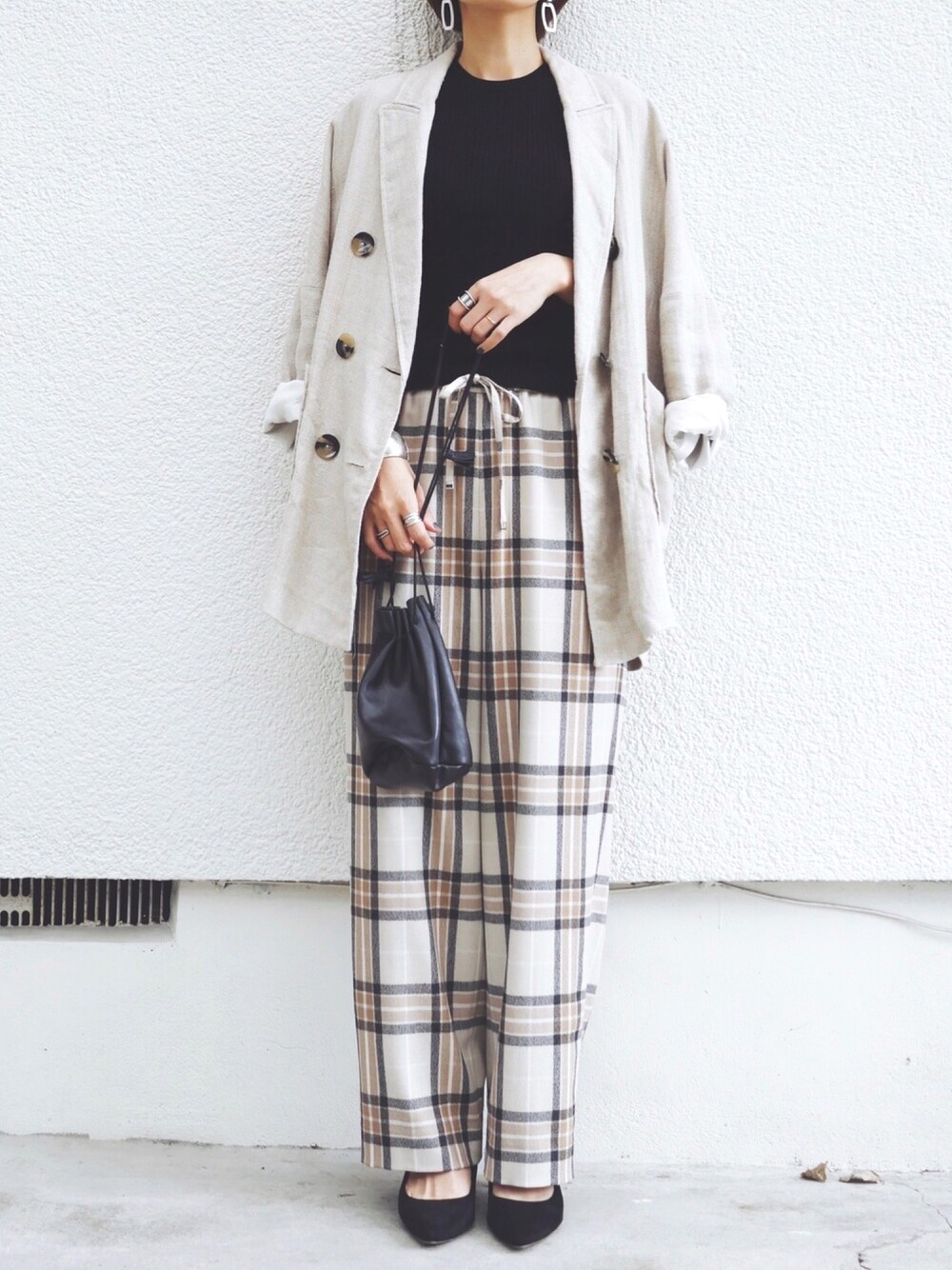 秋冬はやっぱりチェックに目が行きます👀✨ 黒×ベージュでシンプルに🧡🖤 JK…ZARA 🎽…jeanasis 👖…united arrows 👜…the case 👠…menue